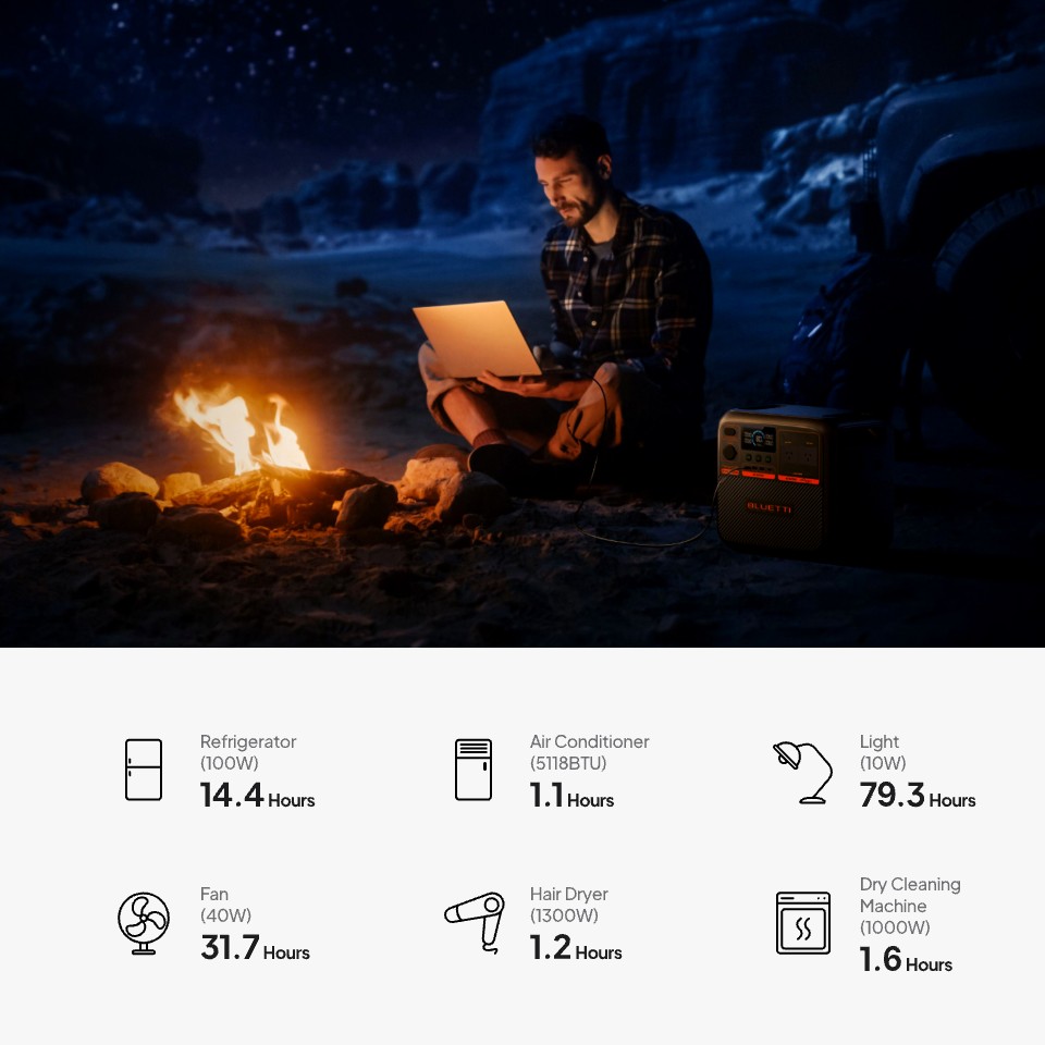 Wherever you are, experience lightning-fast charging that keeps your devices running without delay. The TurboBoost technology allows you to reach 80% charge in just 1.1 hours. While exploring the outdoors, you can access solar energy and get a full charge in about 2.4 hours. Even driving on the road, you can charge it efficiently via our latest innovation – BLUETTI Charger 1, which is 6X faster than conventional car chargers.